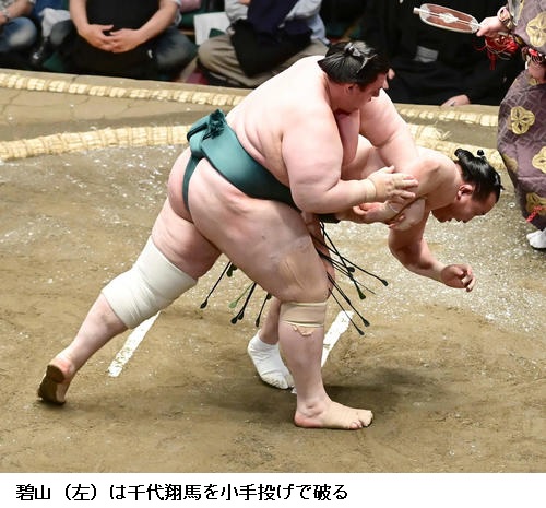 ▽碧山に千代翔馬は、碧山が小手投げで勝って5連勝としました。