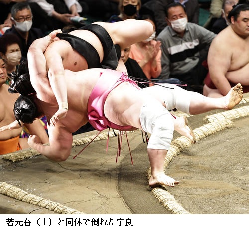 ▽宇良に若元春は取り直しの一番となり、若元春が送り出しで勝ちました。