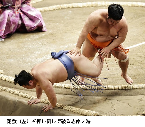 ▽志摩ノ海に翔猿は、志摩ノ海が押し倒し。