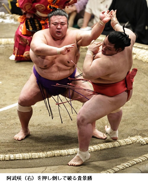 ▽阿武咲に大関 貴景勝は、貴景勝が押し倒し。