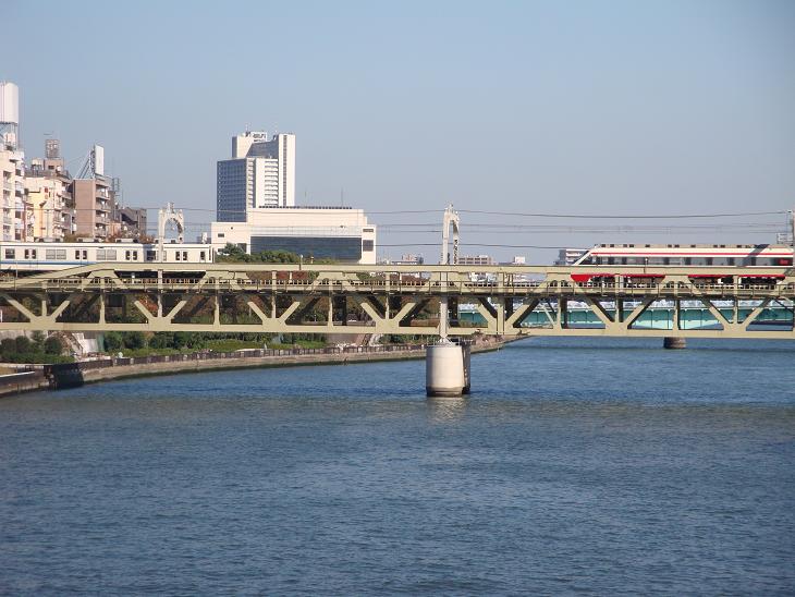 鉄橋ですれ違う特急と普通