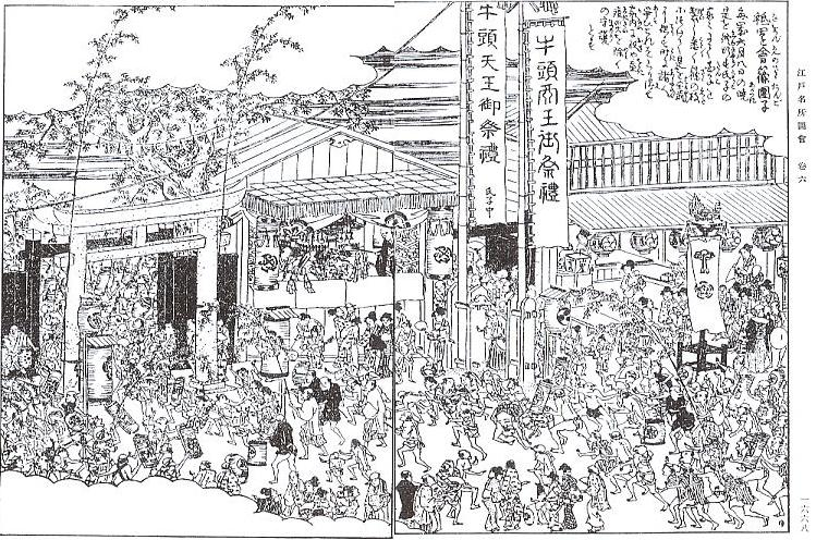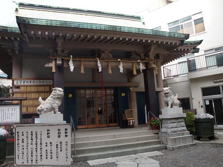 ここ蔵前の須賀神社の創建は「當社牛頭天王縁起」によれば推古天皇の御代(西暦600年)。御祭神は素盞鳴尊(すさのおのみこと)、御神徳は目的完遂、病気平癒など。上記縁起によると、推古天皇九年(601年)の夏、この地に疫病が流行した。ところが、このあたりの森に牛頭天王を祭った祠(ほこら)があったので、その祠に郷の人々は病気平癒を祈ると、尽く快気したと記してあるという。また「天王塚碑文」、「求涼雑記」、「江戸名所図会」、「新板御祭礼双六」などにも登場し、江戸時代には祇園社、蔵前牛頭天王、団子天王、笹団子天王などと呼ばれ、経済力のある氏子の札差らに支えられ 祭礼も盛大であったようだ。明治時代の神仏分離令により、天台宗東叡山寛永寺真鏡山宝現院大円寺より分離され、須賀神社と改名され、古社であるが、関東大震災の災失、第二次世界大戦の焼失のため 昭和36年造営の鉄筋コンクリート社殿であるという。