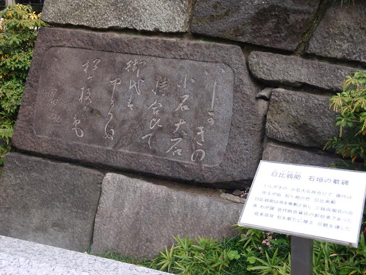 隅田公園の桜並木もすっかり色づき、遊歩道は落ち葉で敷き詰められている。昼間の散策は誘惑が多い。墨田区役所の裏手、勝海舟の銅像の脇にカフェがあり、ここでコーヒーを飲む。源森橋に出て、言問橋東詰めから見番通りを北上する。途中、三囲神社の入口に日比翁助(1860~- 1931年、三越でパートの創始者)の石垣の歌碑がある。