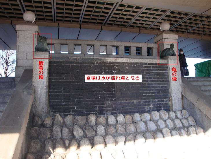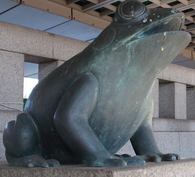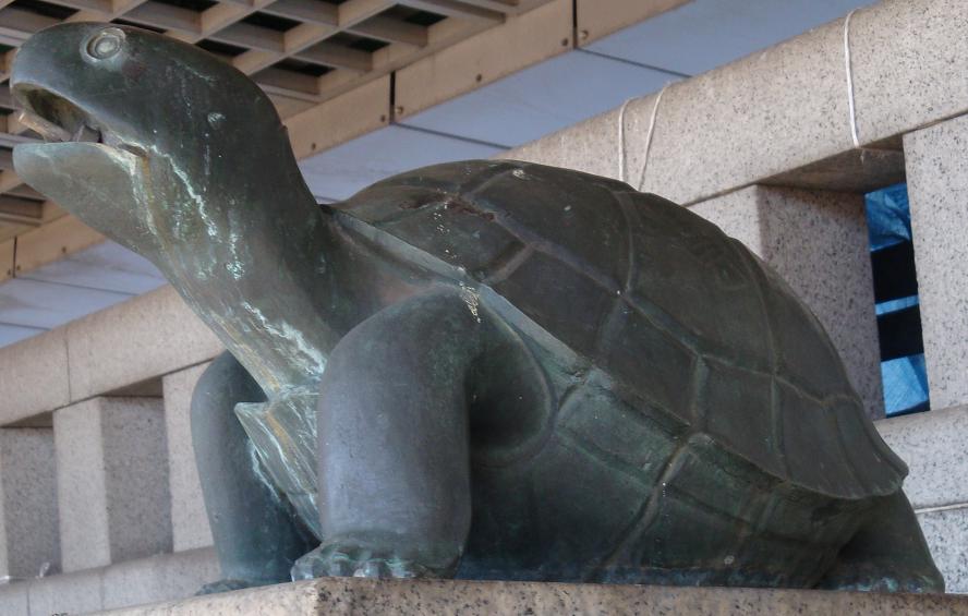 吾妻橋を渡って、三つ目通りから、水戸街道に入り、桜橋通りを通って、高速6号線の下の桜橋に出る階段を上ると、そこに蝦蟇左大臣と亀右大臣が、鳩の屎を浴びながら鎮座ましましている。どうして、ここに蝦蟇と亀の像があるのか良く判らない。蝦蟇と亀の話は宋の蘇軾(1036~1101年)の戯撰であるといわれいる「艾子(がいし)雑説」の中に寓話が出ていたように思うが、ここ向島の地に何かいわれでもあるのだろうか。今度調べてみよう。