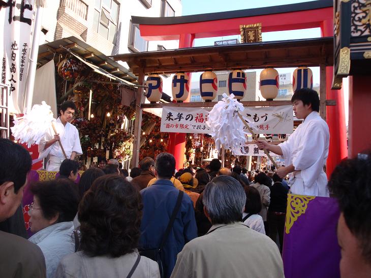 ここから、お酉さまにお参りする。昨年は境内にも入れないほど人波が道にはみ出していたが、混むには混んでいたが、どうやら境内に入ることが出来た。鳥居の下で両側からお祓いをうけ、境内に入る。