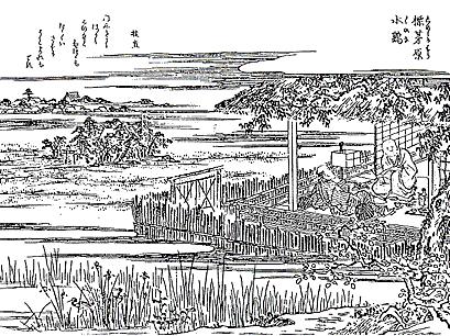 江戸時代のこの景勝について『遊歴雑記』に記述がある。曰く、「武州豊島郡三谷町の東裏、玉姫稲荷の宮は浅ぢが原の西、耕地の中弐町にあり。社内尤(もっとも)広く、東南北の三方の耕地を見はらし、元より江戸の片ほとりの田舎なれば、社内の廻り、垣根等の構えなく、松・杉こころままに繁茂し、木の間に古樹のさくらも四五株あれど、誰手折るいたづらなければ天然に咲乱れ、道敷の外は芝生じて苅込ざるに、そのうつくしさ人のあそぶ事邂逅(たまさか)なれば、諸鳥此神地に求食、市中に遠からずして、而も閑寂の勝地たり。扨又(さてまた)、風色の天然、眺望の面しろき、田の畦には摘草する徒あり。又、田螺拾ふ人あり。或は畦路を人の行通ふ。花あり、芽出しの樹々あり。扨遥に北西をかえり見れば、千住・小塚原より縄手路を三谷へ往来の、引もちぎらざる、田に畑に菜のはなの見事なる、その景望一々兎角の論なし。」