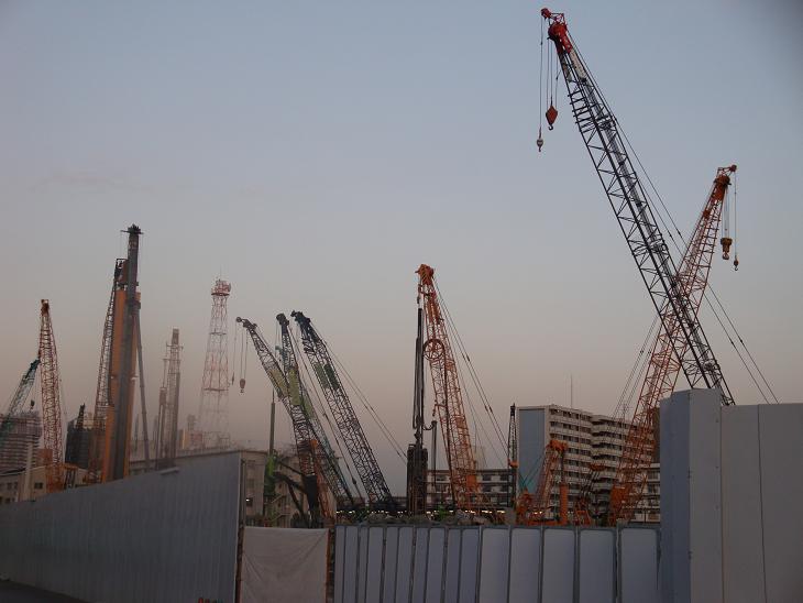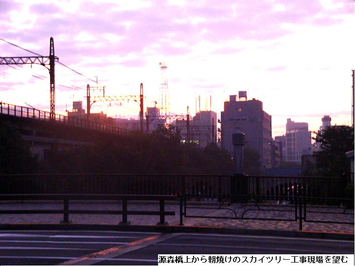 三つ目通りまで来ると、辺りが白んでくる。源森橋から東京スカイツリーの工事現場を望むと、そこは朝焼けで染まって綺麗だ。源森橋を渡って水戸屋敷に入ると、今まで気付かなかったけれど今通ってきた道に沿うように庭園内部に大きな石碑があり、説明板が立っている。説明板は辛うじて「堀辰雄住居跡」と読めるが、どうやら巨大石碑とは関係なさそうである。ようやく明るくなりかけていたが、瞼をおぴろげて石碑の字面を辿ったが、何が書いてあるかよく判らない。最後の部分に「勝安房篆額」とある。こんど何時の日にか調べてみることにしよう。堀辰雄住居跡の説明板もカメラに収めてみたが、露出不足でよく読めない。これも次の機会にしよう。