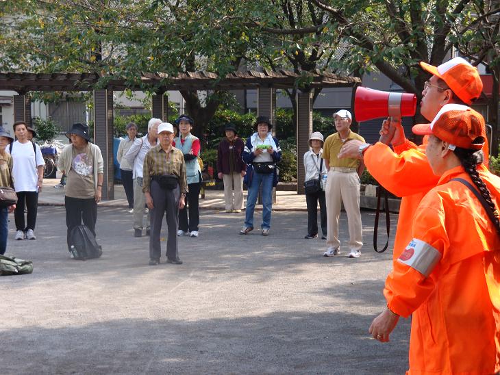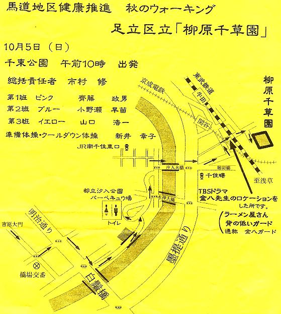 秋晴れの好天気で陽気はよいし、何時もの早朝徘徊とはまた趣をことにするものと、金魚のウンコよろしく、お供することにした。集合は千束公園、9時15分、婆様と一緒にS氏夫人のMakiちゃんを誘いに行く。S氏の玄関先で夫妻の写真を撮る。S氏はお家でお留守番とのこと。千束公園で署名し、待機していると、松戸小金でご近所だったY氏ご夫妻にあった。9時50分頃、説明注意があって、準備体操。千束公園から千束通りを抜けて吉原大門、あさひ会商店街を抜けて、明治通りにでて、白鬚橋の西詰めから、汐入公園に入る。まあなんとチラシには「歩くことに自信のない年配の方、お子様連れの方でも大丈夫です」とあったにもかかわらず、爺の早朝徘徊に比べると随分早足で歩いているようだ。バーベキュー広場で休憩。日曜日とあって、大勢の人がバーベキューを楽しんでいた。ここで兼愛塾の塾生であったT氏に出会う。いやはや、何年ぶりの出会いであろうか。汐入大橋を渡り、狭い自動車1台が抜けられるかどうかの道を長い列をなしてぞろぞろと付いてゆく。柳原千草公園に着いたときはもう12時知覚出会った。小ぢんまりとした、趣のある公園であるが、あんまり広くは知られていないというのが気にいった。