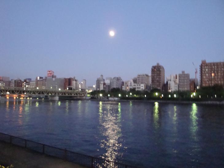 5時徘徊に出かける。時計を忘れたが、駒形橋を渡るときはまだ暗い。墨田区側の遊歩道を北上。枕橋付近で白み始める。桜橋を潜り抜けた曳船が対岸のリバーサイドスポーツセンターの前を下ってくる。桜並木の中で顎をう~んと突き出して、中天を見上げると桜の枝葉の間に下弦の月が輝いている。
