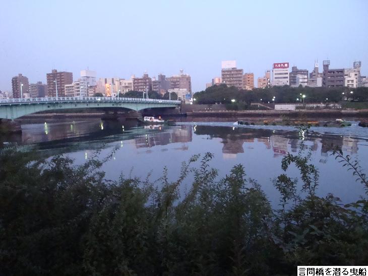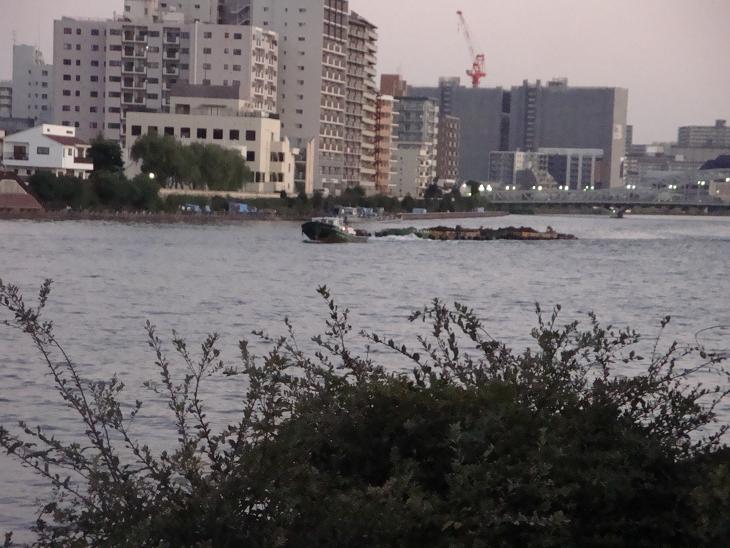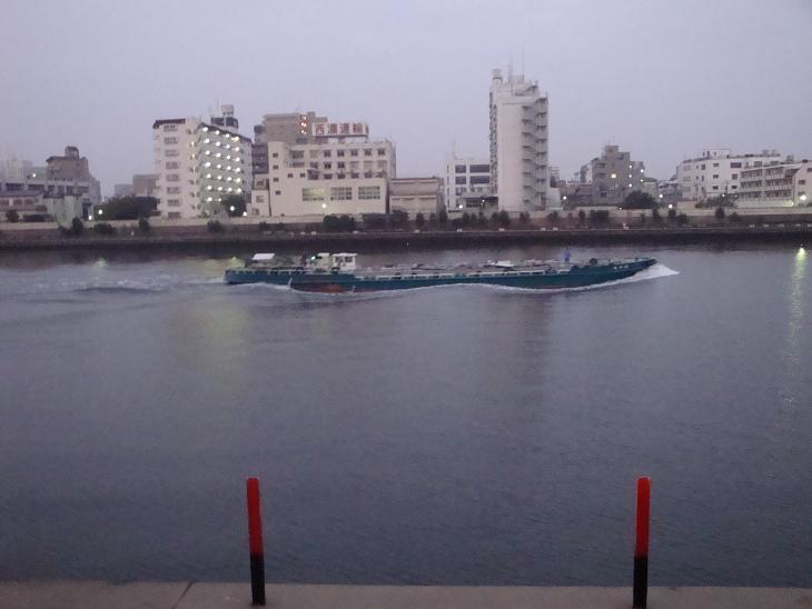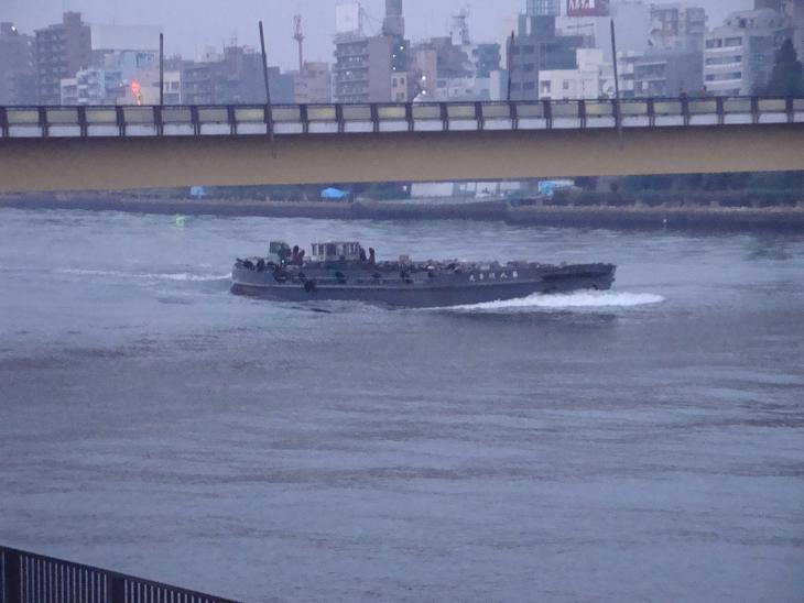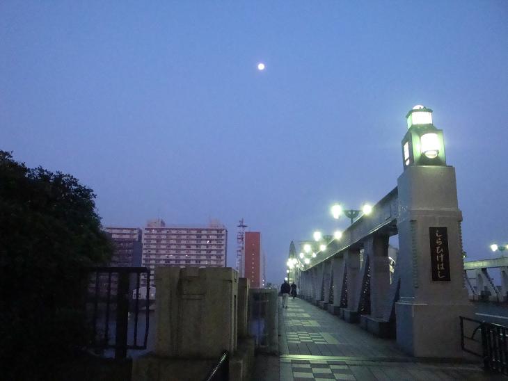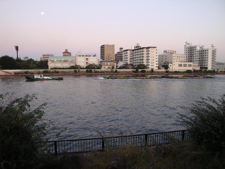 今朝は昨日のコースを逆回りした。白鬚橋を渡る頃にやっと、白け始める。青御殿通りを桜橋に向けて歩いていると、ポンポンと小気味よい音を立てて、荷役船が大川を昇ってゆく。何処かのだるま船を引きに急いでいるようである。桜橋を正に抜けようとする荷役船があったが、こちらの方はポンポンて音を立ててないところをみると、ディゼルエンジンの曳船かもしれない。昨日の下弦の月はやや痩せ細り、西の空から中天に差し掛かろうとしていた。