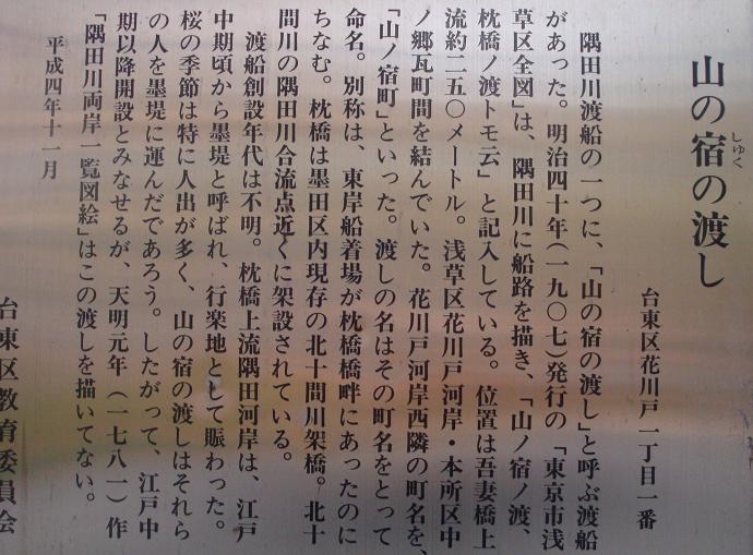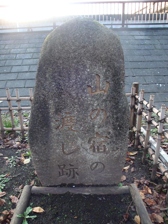東武伊勢崎線のガード付近はごく最近まで橋梁補修のため板塀で囲んであったのだが、補修工事が終ったらしく、板塀が取り除かれてスッキリした。ガードを潜ると今まで板塀に隠れて見えなかった山の宿の渡し跡の石碑が姿を見せていた。