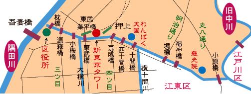 浅草通りが大横川を渡るところが業平橋(なりひらばしである。業平橋)は『伊勢物語』の主人公であるとされている平安時代の歌人・在原業平に因んでいる。川は橋のある部分も含めて部分的に埋め立てられたが、橋は残っている。また、隅田川に架かる吾妻橋の別称とも言われているということじゃ。この橋のこの辺いったいの地域も業平と呼ばれている。おなじ名前の橋が埼玉県にもあるが、奈良県・兵庫県にもある。埼玉県の業平橋は同じ由来を持つものであるが、兵庫県のものは在原業平が芦屋市に住んでいたことから、また奈良県のものは八尾市に伝わる『業平の高安通い』に因むものであるそうじゃ。
