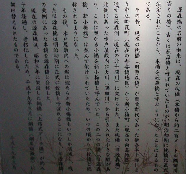 隅田公園を抜けると何となく、吾妻橋を渡り、そのまま墨田区役所の表玄関前に出て、枕橋手前を右折すると、そこは源森橋であった。橋口に由来碑が立っている。
