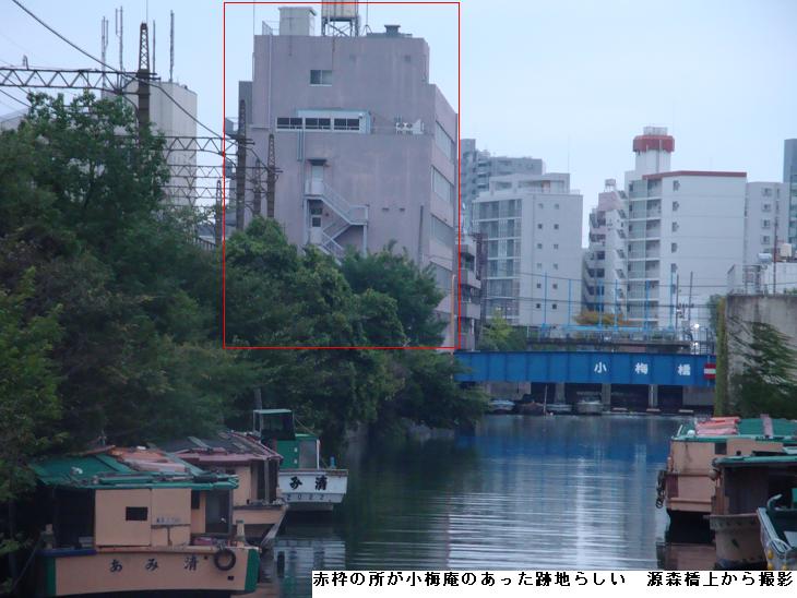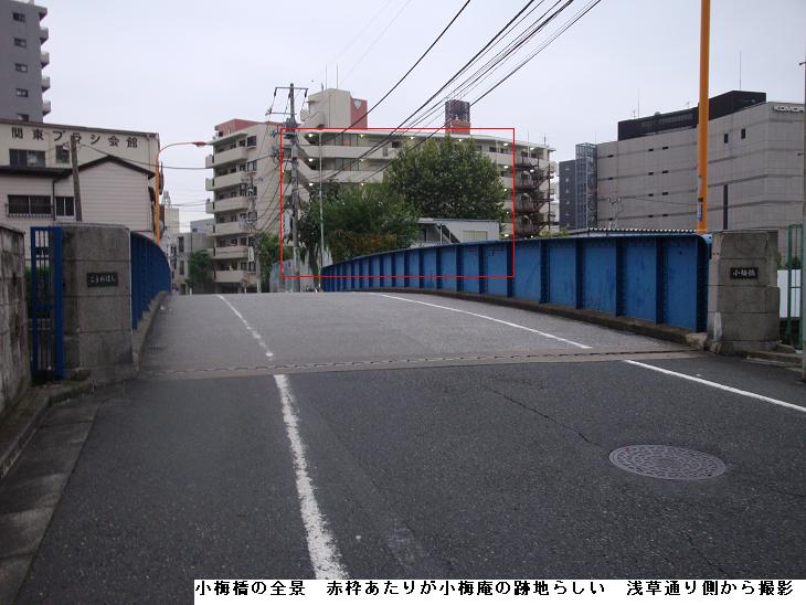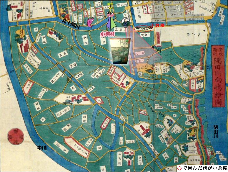 「小梅橋」は、新しいもので江戸時代や明治時代の地図にも出てこない。また、現在でも普通の地図では名前が書かれていない可哀そうな橋なんじゃと。江戸時代に描かれた隅田川向島絵図によると、現在の小梅橋を渡ったあたりのところに「小倉庵」(古地図で○で囲んで置いた)という料理屋があったらしい。江戸時代には、「今戸で大七 有明桜、小梅でおしるこ 小倉庵」とうたわれたほど有名だったそうです。 はじめておしるこを料理として出したのも小倉庵だそうですよ。“隅田川向島絵図”で、“小倉庵”の表記を見ることができます。ただ、残念なことに、幕末に旗本の青木弥太郎(やたろう・家禄二百石、元勘定衆)と強盗を働いた一味の一人に、この小倉庵の跡取り息子の長次郎がいたそうで、いろいろあって今では跡形もありません。古地図の右側の大きな川が、隅田川。地図の一番上を横に流れているのが、北十間川(きたじゅっけんがわ)。北十間川は業平橋(なりひらばし)のあたりで堰きとめられていたんじゃ。古地図の上の部分に「小梅村」と横に書かれているところが、新タワーの建設予定地なんじゃ。