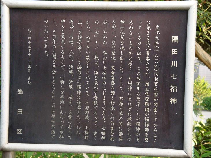 ゆっくり秋の七草をカメラに収めようと思ったのだが、萩のトンネルを撮るのがやってであった。そばにいた中年の小母さんにシャッターを押してもらった。山上憶良の秋の七草の碑をカメラにおさめ、追い出されるように百花園を出ると入り口のところに隅田川七福神の由来の説明板があったので収めておいた。