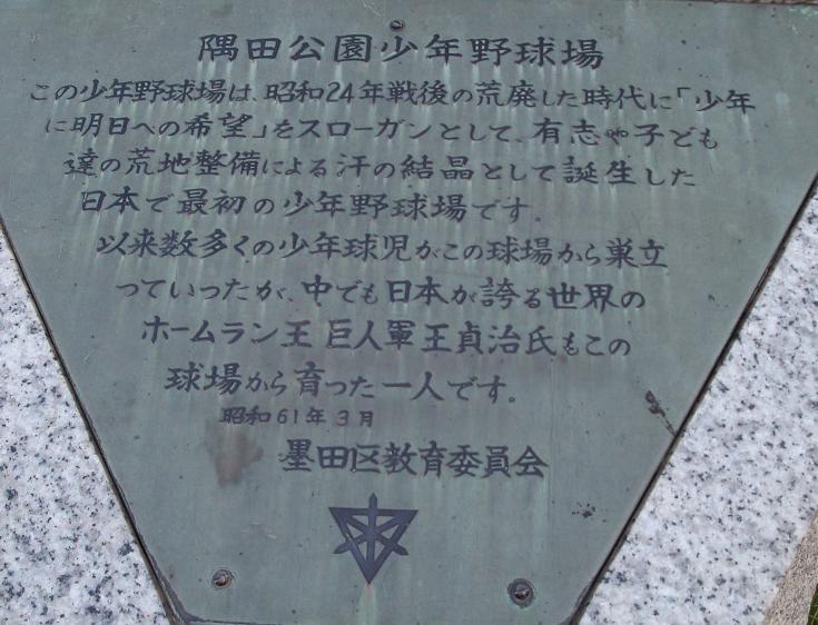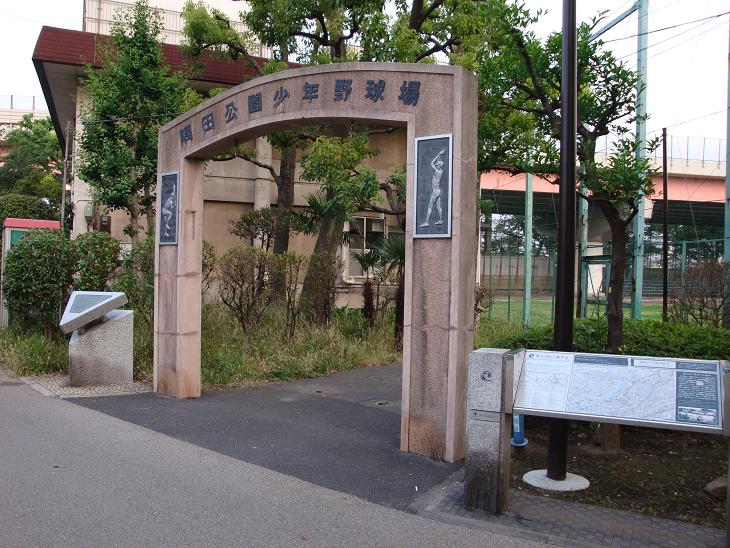 言問団子の隣にある少年野球場は、王選手の少年時代ここで野球をしていたそうである。入り口には1本足打法のレリーフが飾られている。