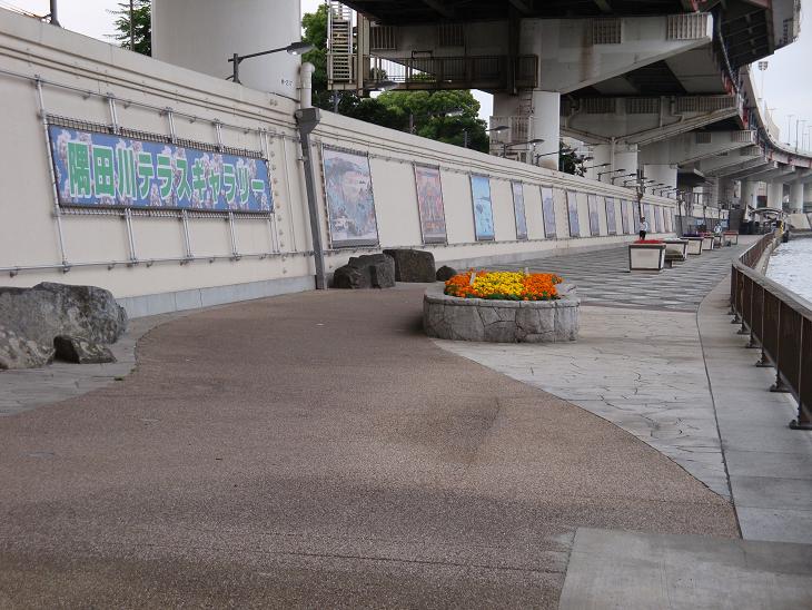 桜橋から白鬚橋の間は墨田区側も川沿いの道は単調そのもの、高速6号線の騒音を聞きながら歩くことになる。大川側はコンクリートの壁が続き、墨堤通り側はブルーシートの御殿が並ぶ。頭上は大きなカーネズミが行き交う天井。