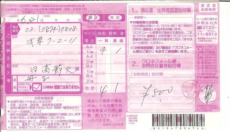 きのうの朝9時には速達便で出しているのに、まだ着かぬとは… まあ、別に急ぐ必要はない。日頃からIN兄の信頼厚きクロネコなれど、こんなこともあるんだろうな。
