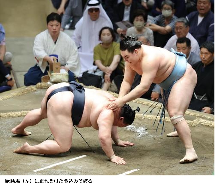 新入幕の欧勝馬(27=鳴戸)は正代(32=時津風)をはたき込んで3敗をキープした。