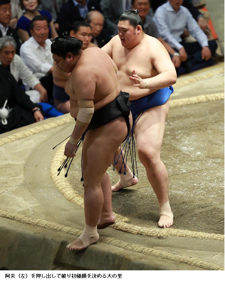 小結大の里(23=二所ノ関)が、初土俵から所要7場所の史上最速優勝、さらには67年ぶりの新三役優勝を飾った。単独トップで臨んだ1差の関脇阿炎との大一番を、立ち合いから一方的に押し出しで制した。負ければ阿炎らとの優勝決定戦に回る可能性があったが、12勝3敗で初優勝を手にした。土俵下の控えではこらえていた涙が、花道を引き揚げ、付け人らに祝福されるとあふれ出した。
