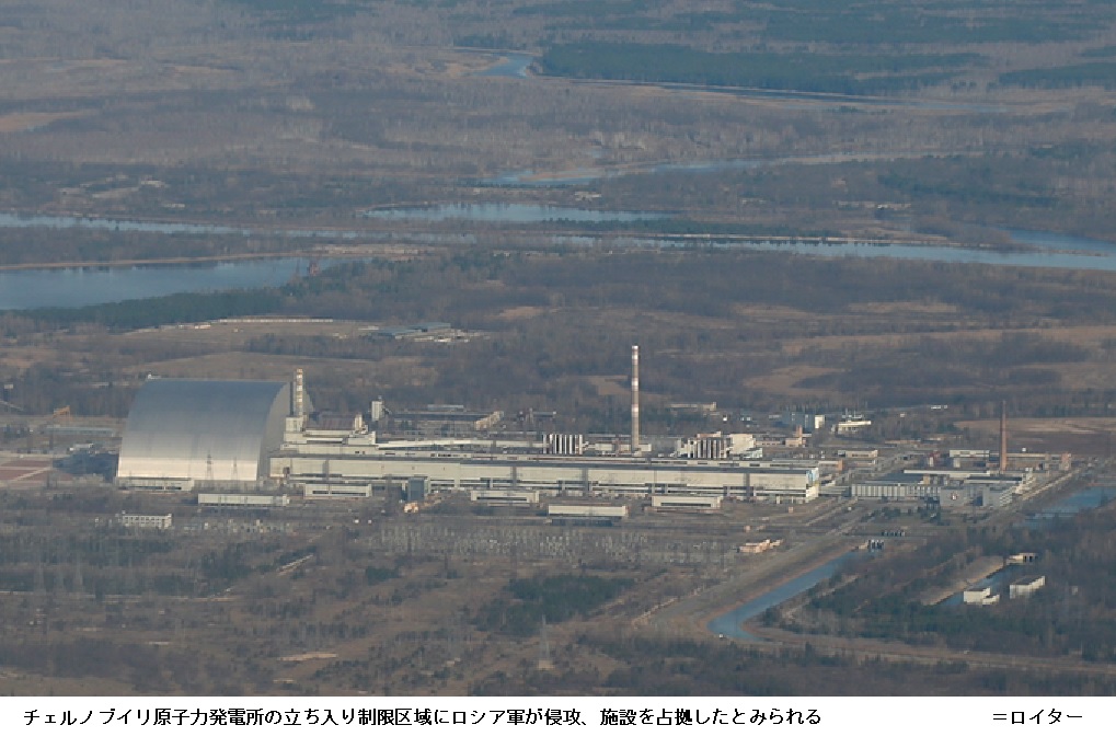 24日にはウクライナ北部にあるチェルノブイリ原子力発電所がロシア軍に占拠された。同原発では旧ソ連時代の1986年に爆発事故が発生した。半径30キロメートル圏内は立ち入り制限区域に指定され、鋼鉄製シェルターで事故機を覆った2016年以降も内部で処理作業が続く。ロシア軍の攻撃で原発が損傷する事態となれば、周囲に放射能汚染物質が飛散する恐れがある。原発はキエフの北側約100キロメートルに位置する。