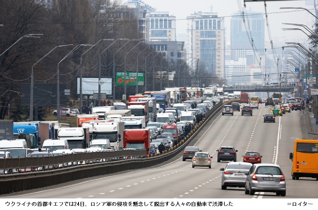 キエフではロシア軍の侵攻に対する警戒感が高まっている。24日には首都から離れようとする市民らの自動車が殺到し、幹線道路で大規模な渋滞が発生した。