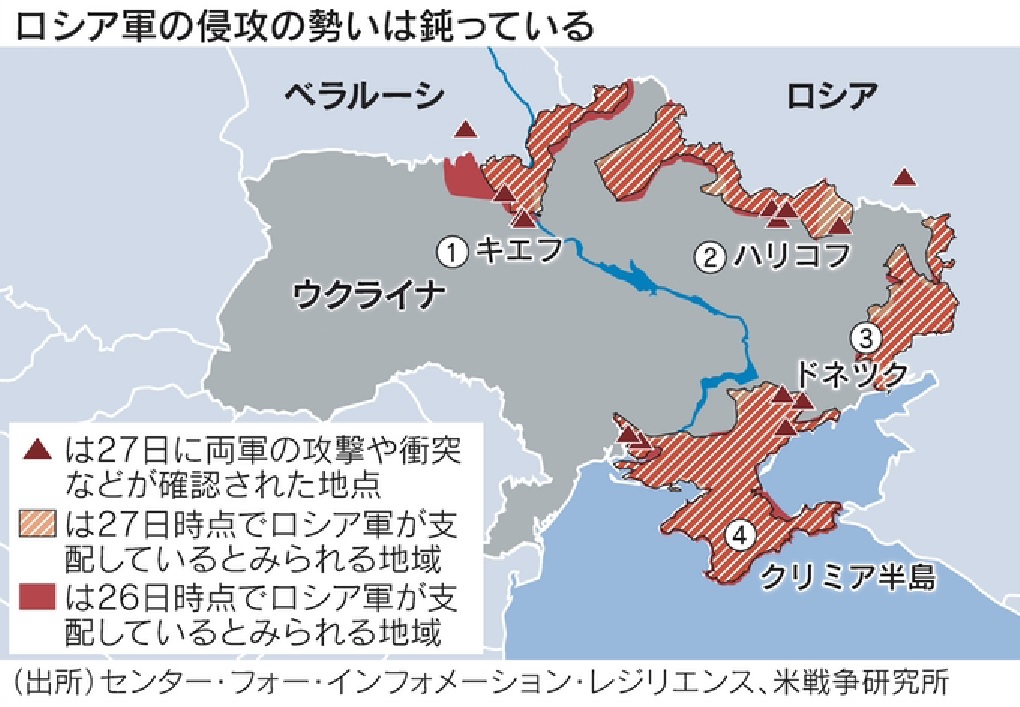ロシア軍はロシアが国境を接するウクライナ東部のルガンスク州などだけでなく、ベラルーシの国境から南下してキエフに近づいているほか、ウクライナ南東部のマリウポリなどにも侵攻したもようだ。空爆で軍事施設の機能を失わせた後、ウクライナの周辺3方向からウクライナに侵攻する考えとみられる。