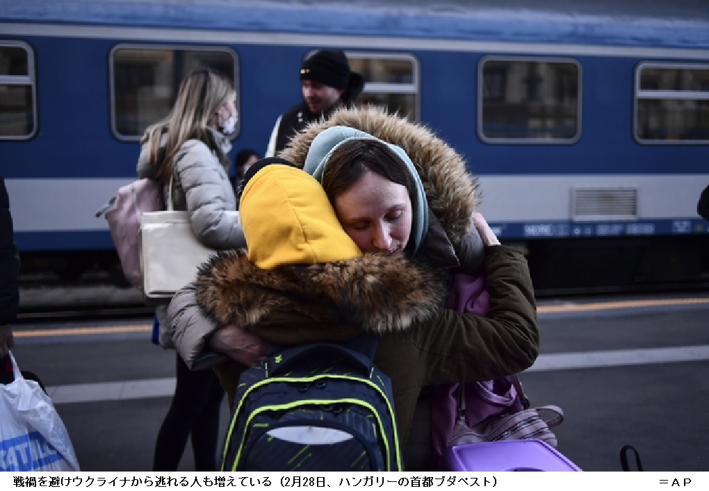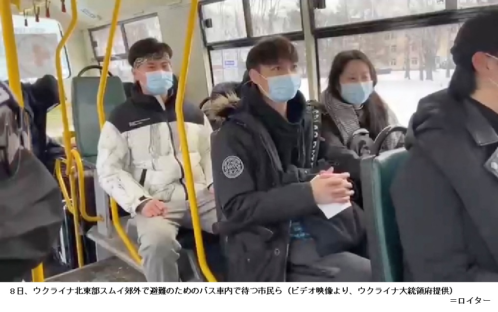 ウクライナ住民の避難難航 「人道回廊」をロシア攻撃か ―― ウクライナでロシア軍に包囲された地域から住民を避難させるための「人道回廊」を通じた脱出が8日、一部で始まった。ただ、多くのルートはなお利用できない状況で、多数の市民が都市にとじ込められたまま食料や水の不足に苦しんでいる。