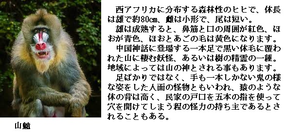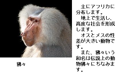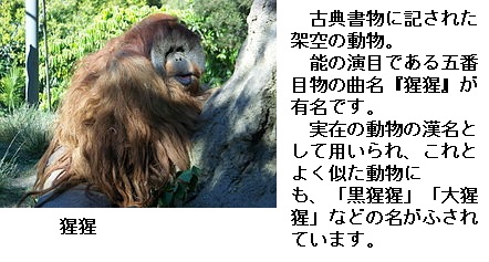 3 狒々 →ヒヒ 4 猩々 →ショウジョウ