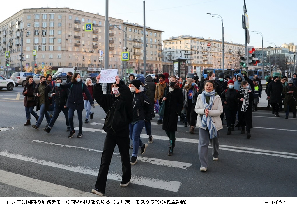 ロシア国内ではウクライナへの侵攻に抗議するデモが各地で発生、取り締まる動きも起きている。インタファクス通信は24日、モスクワで開催された無許可の集会に参加したとして警察が約600人を拘束したと伝えた。 【日本經濟新聞 2022年2月25日 4:37 (2022年2月25日 8:21更新)】