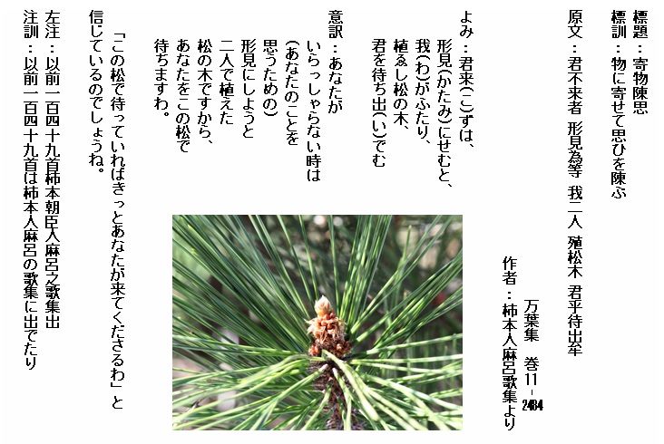 巻11-2484:君来ずは形見にせむと我がふたり植ゑし松の木君を待ち出でむ