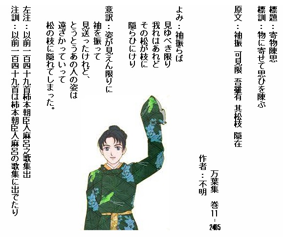 巻11-2485:袖振らば見ゆべき限り我れはあれどその松が枝に隠らひにけり