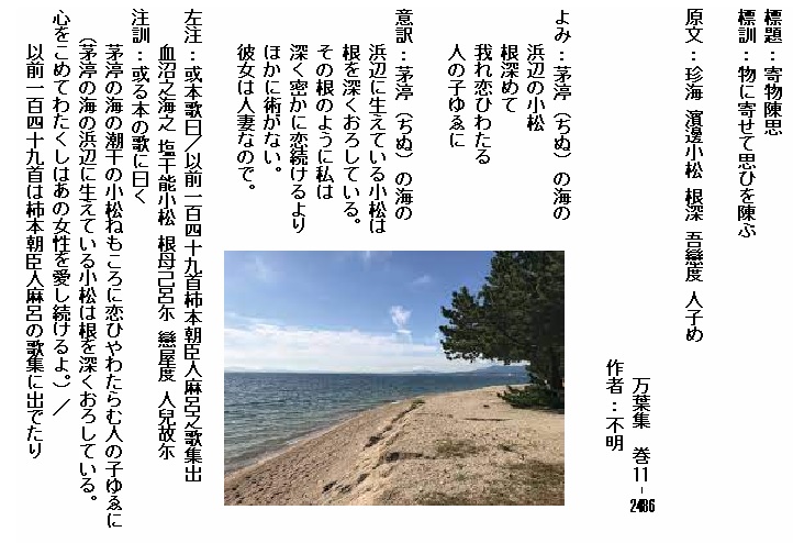 巻11-2486:茅渟の海の浜辺の小松根深めて我れ恋ひわたる人の子ゆゑに