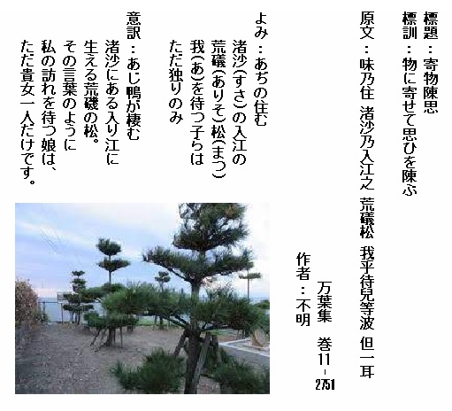 巻11-2751:あぢの住む渚沙の入江の荒礒松我を待つ子らはただ独りのみ