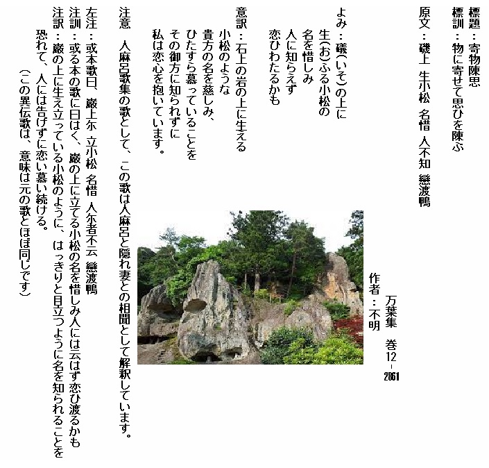 巻12-2861:礒の上に生ふる小松の名を惜しみ人に知らえず恋ひわたるかも