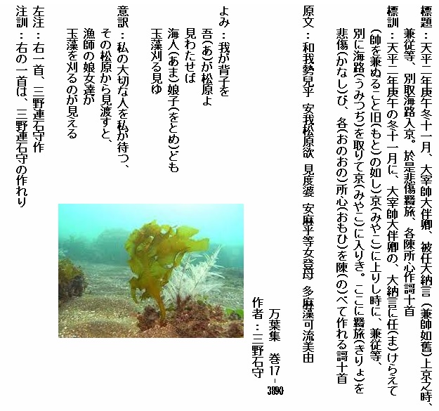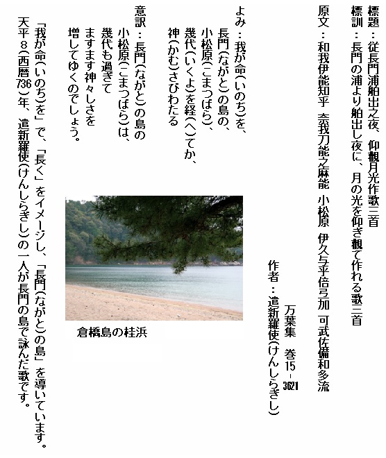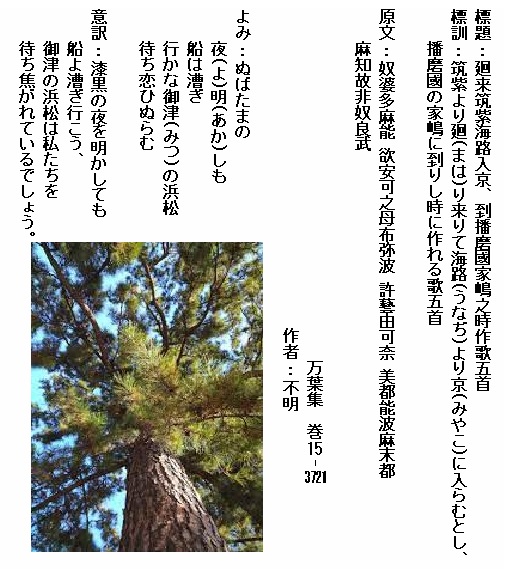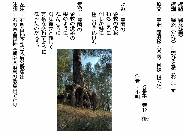 よみ:見欲(ほ)しきは 雲居に見ゆる うるはしき 鳥羽(とば)の松原 小子(こども)ども いざわ出で見む 琴(こと)酒(さけ)は 国に放(さ)けなむ こと避(さ)けは 家に離(さ)けなむ 天地の 神し恨めし 草枕 この旅の日(け)に 妻離(さ)くべしや