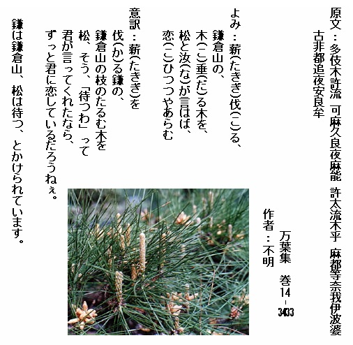 巻14-3433:薪伐る鎌倉山の木垂る木を松と汝が言はば恋ひつつやあらむ