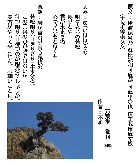 巻14-3495:巌ろの沿ひの若松限りとや君が来まさぬうらもとなくも