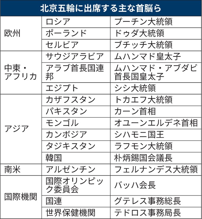 中国外務省によると、北京五輪の開会式には約30人の首脳級や国際機関のトップが出席し、習氏との会談などを予定する。中国には各国との関係深化を強調し、対立する米国の立場が国際社会を主導するものではないと国内外に印象づけたい考えがある。