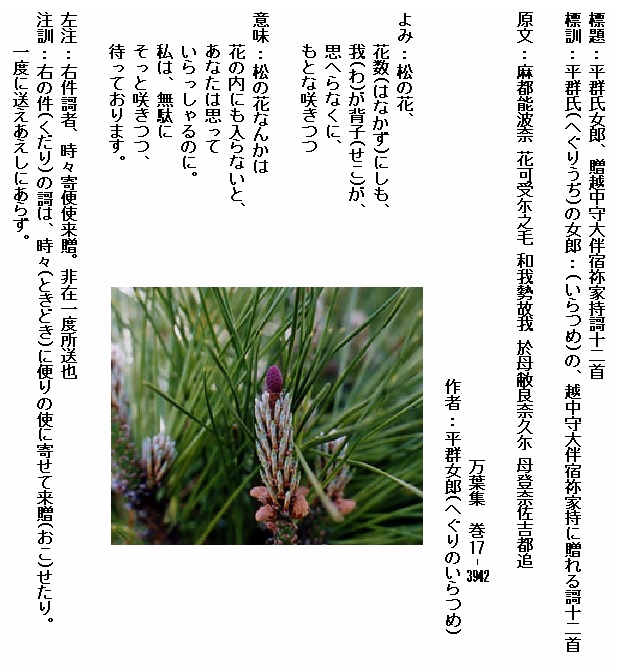 原文:荒玉之 年者来去而 玉梓之 使之不来者 霞立 長春日乎 天地丹 思足椅 帶乳根笶 母之養蚕之 眉隠 氣衝渡 吾戀 心中少 人丹言 物西不有者 松根 松事遠 天傳 日之闇者 白木綿之 吾衣袖裳 通手沾沼
