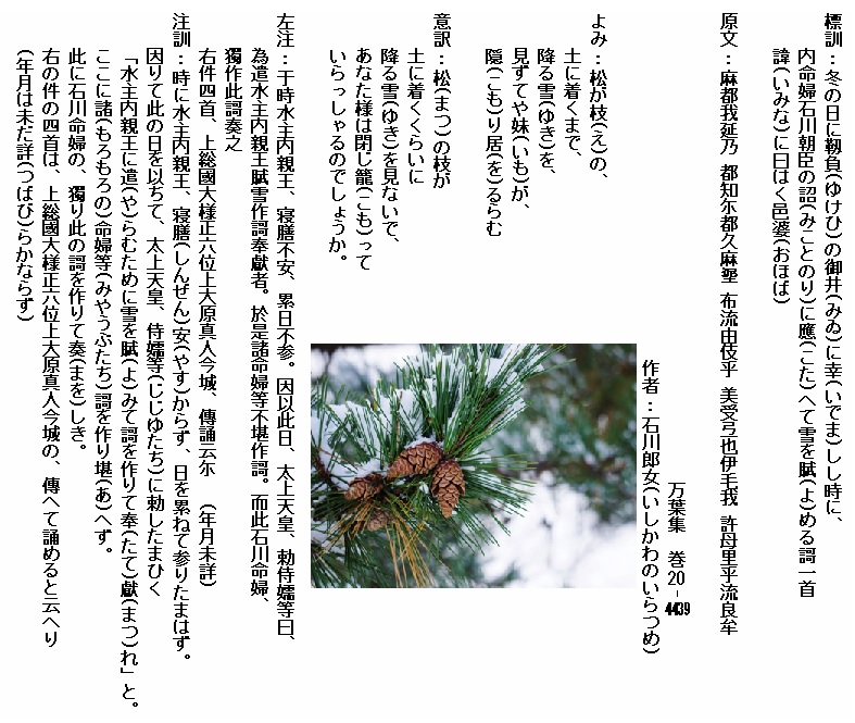巻20‐4439: 松が枝の土に着くまで降る雪を見ずてや妹が隠り居るらむ