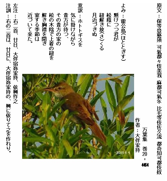 20‐4464:霍公鳥懸けつつ君が松蔭に紐解き放くる月近づきぬ