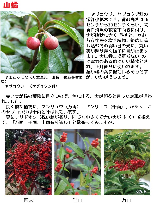 山橘(やまたちばな)は、現在のヤブコウジ科ヤブコウジ属の常緑低木の藪柑子(やぶこうじ)にあたります。夏に数個の花を咲かせ,秋から初春にかけて赤い実をつけます。葉が橘(やまたちばな)の葉に似ていることから、山橘(やまたちばな)と呼ばれたようです。