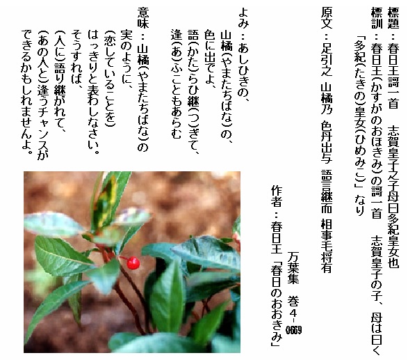 巻4-0669:あしひきの山橘の色に出でよ語らひ継ぎて逢ふこともあらむ