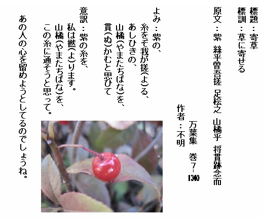 巻7-1340:紫の糸をぞ我が搓るあしひきの山橘を貫かむと思ひて
