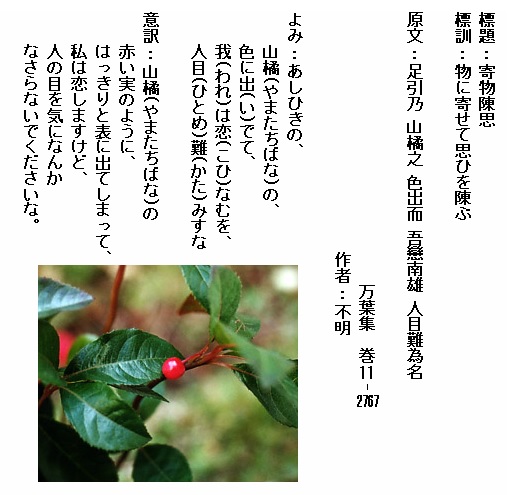 巻11-2767:あしひきの山橘の色に出でて我は恋なむを人目難みすな
