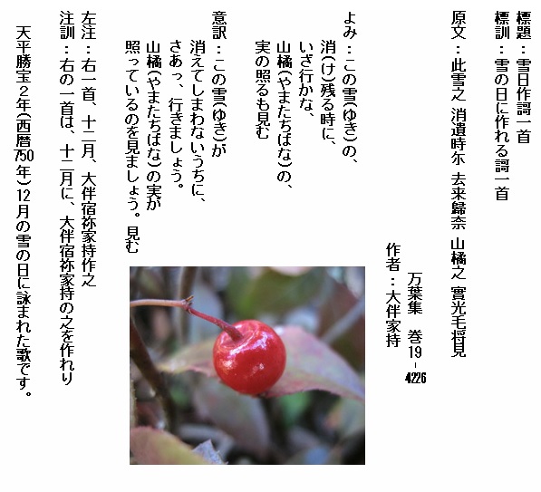 巻19-4226:この雪の消残る時にいざ行かな山橘の実の照るも見む