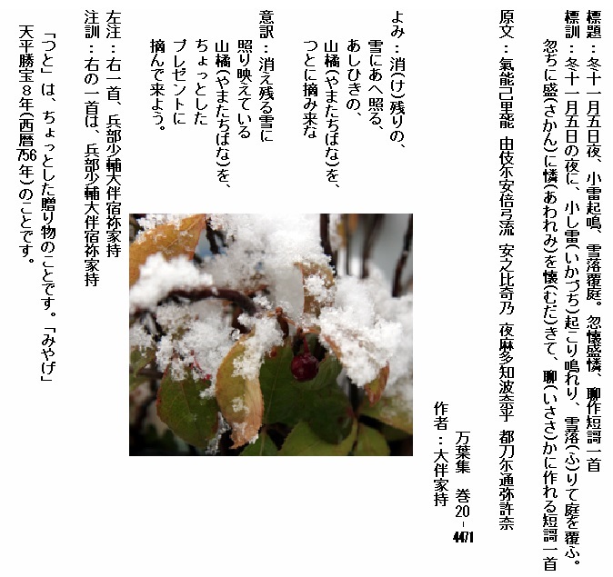 巻20‐4471:消残りの雪にあへ照るあしひきの山橘をつとに摘み来な