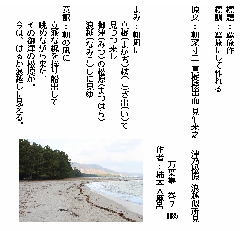 巻7-1185:朝なぎに真楫漕ぎ出て見つつ来し御津の松原波越しに見ゆ