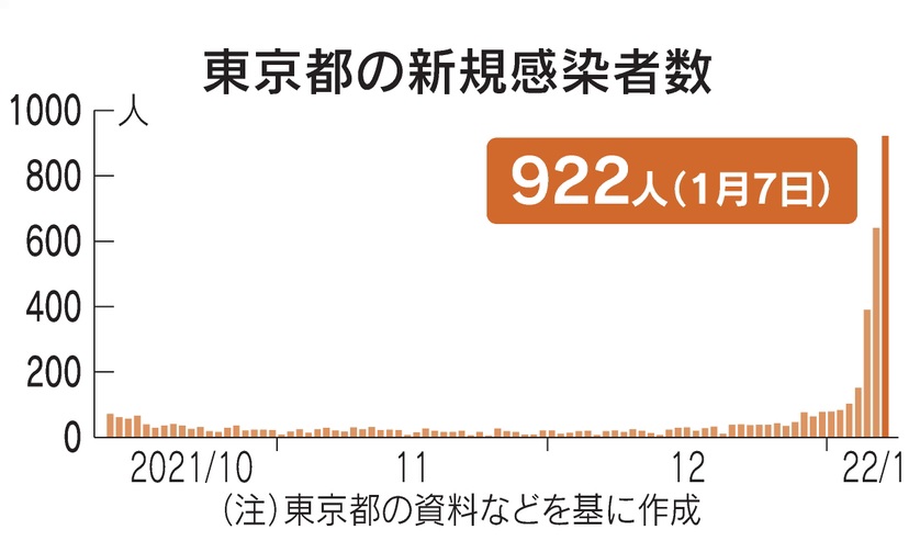 東京都、新たに922人感染 7日平均で前週の6.2倍 ―― 東京都は7日、新型コロナウイルスの感染者が新たに922人確認されたと発表した。直近1週間平均の新規感染者は約338人で、前週(約54人)比で623.6%だった。